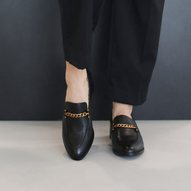 Indulge in luxury with our CASTELLA leather loafers. Crafted with a discerning eye for detail, each shoe features a classic design and a sleek block heel for effortless style. Adorned with a hand-finished metal chain, these loafers epitomise elegance and sophistication. Experience the superior quality and craftsmanship for yourself.
