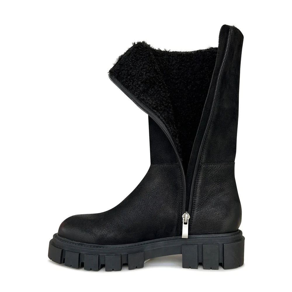 Shearling are your new hiking utility boots, blended with style and comfort for the season. The epitome of chic style and comfort, these mid-high boots feature warm shearling lining enhanced by stitching details and a full length inner zipper. They are developed on a chunky lug sole and feature eye-catching stitch detail in the most luxurious Italian Nubuck leather.